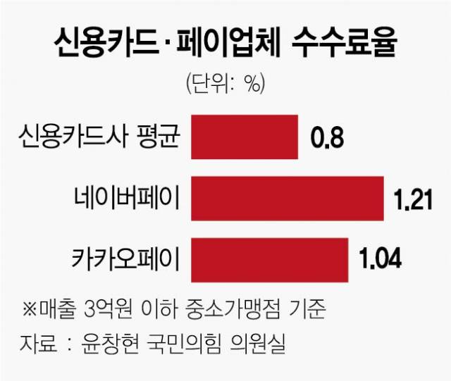 반면 이 같은 수수료율 인하 압박은 간편 결제 업체에는 적용되지 않고 있다. 네이버페이·카카오페이 등 간편 결제는 신용·체크카드와 사실상 유사한 결제 기능을 수행하고 있지만 전자금융업자로 분류돼 당국의 수수료율 규제에서 벗어나 있다. 윤창현 국민의힘 의원실에 따르면 매출 3억 원 이하 중소가맹점의 신용카드 수수료율은 0.8%인 반면 네이버페이·카카오페이의 카드 결제는 각각 1.21%, 1.04%로 오히려 더 높다. 카드 업계의 한 관계자는 “사실상 같은 시장, 같은 고객을 놓고 경쟁하고 있는데다 수수료율은 간편 결제 업체가 더 높은데도 카드 업계만 규제를 받는 것은 불합리하다”고 언급했다.