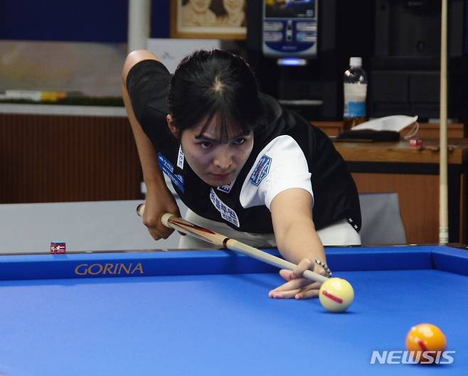 [청주=뉴시스] 조성현 기자 = 12일 오후 충북 청주시 흥덕구 송절동 피아비큐 당구장에서 열린 '1회 스롱피아비배 아마추어 3쿠션 대회'에서 스롱 피아비 선수가 우승자인 유호관(피아비큐)씨를 상대로 이벤트 경기에 임하고 있다. 2021.09.12. jsh0128@newsis.com