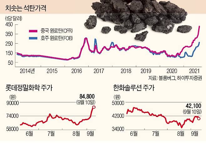 중국發 석탄값 초강세..롯데정밀화학·한화솔루션 웃는다
