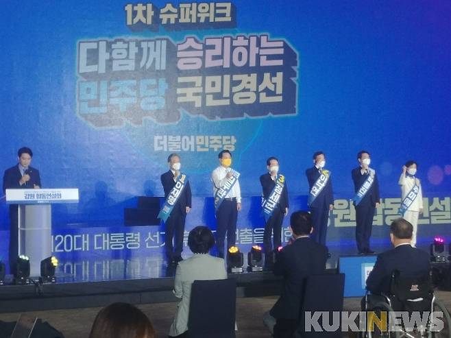 [원주=쿠키뉴스] 박하림 기자 =12일 강원 원주 오크밸리리조트 컨벤션홀에서 열린 더불어민주당 제20대 대통령선거 후보자 선출을 위한 강원 합동연설회에서 후보자들이 구호를 외치고 있다. 왼쪽부터 이재명, 김두관, 정세균, 이낙연, 박용진, 추미애 후보.