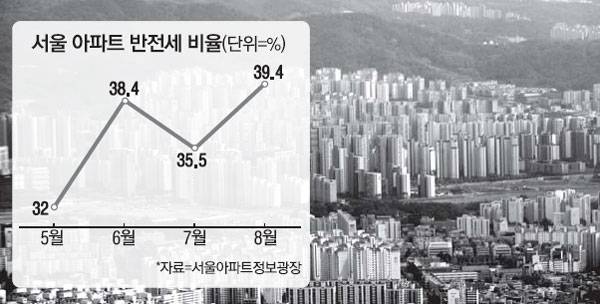 서울에서는 지역을 가리지 않고 반전세 비율이 동반 상승 중이다. 고가 전세가 몰린 강남은 물론 중산층과 서민이 주로 사는 서울 외곽에서도 반전세 증가 현상이 뚜렷하게 관측된다. 강남권에서는 강남구가 지난달 45.1%로 전월(39.1%) 대비 6.0%포인트 증가했고, 송파구 역시 33.8%에서 46.2%로 올라갔다. 아파트 시세가 비교적 저렴한 구로구(46.5%) 등 외곽 지역도 이 비율이 40%를 돌파했다.