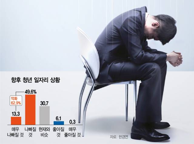 12일 전국경제인연합회 산하 한국경제연구원이 여론 조사 기관 모노리서치에 의뢰해 만 18~29세 542명을 대상으로 실시한 ‘청년 일자리 인식 설문조사’ 결과 응답자의 62.9%는 청년 일자리 상황이 악화할 것으로 전망했다. ‘좋아질 것’이라는 응답자(6.4%)의 10배 규모이며 ‘현재와 비슷할 것(30.7%)’이라는 응답자의 2배가 넘는다.
