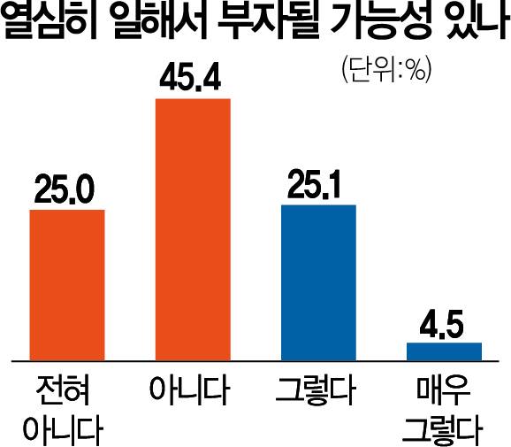청년 층은 특히 열심히 일해도 부자가 될 수 없다고 인식해 근로 의욕이 저하된 상태인 것으로 드러났다. ‘열심히 일하면 부자가 될 수 있을 것이라고 생각하는가’라는 질문에 ‘전혀 아니다’라고 답한 응답자가 25.0%, ‘아니다’는 45.4%를 기록했다. 무려 70.4%가 노력으로 부자가 될 가능성이 없다고 보는 것이다.