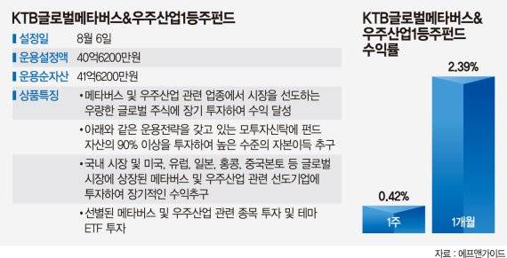 KTB자산운용은 지난달 메타버스와 우주 산업 관련 글로벌 대표 주식에 투자하는 KTB글로벌메타버스&우주산업1등주 펀드(이하 메타버스&우주산업1등주펀드)를 선보였다. 이 펀드는 국내 시장 및 미국, 유럽, 일본, 홍콩, 중국본토 등 글로벌 시장에 상장된 메타버스 및 우주산업 관련 선도기업에 투자해 장기적인 수익을 추구하는 모펀드에 투자하는 재간접펀드이다.