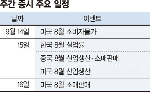 14일에는 미국의 8월 소비자물가지수가, 15일에는 중국의 8월 소매 판매와 산업생산 지표가 발표된다. 15일과 16일에는 미국의 8월 산업생산과 소매판매지수가 각각 발표된다. 특히 미국의 9월 소비자물가지수는 9월 FOMC 회의에 영향을 미칠 수 있어 주목된다.