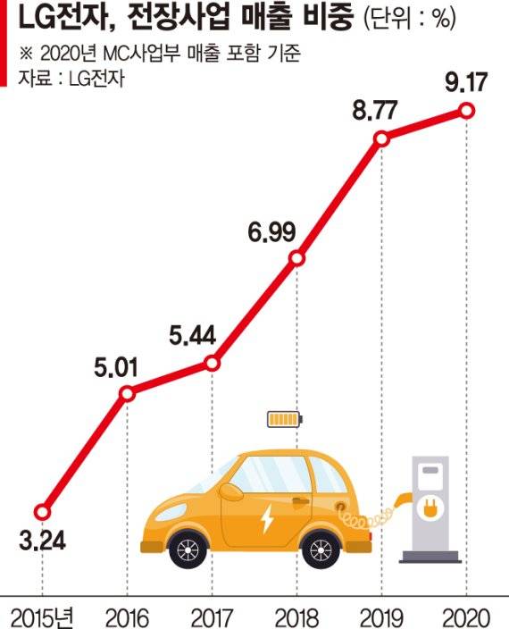 2015년 3.24%에 그쳤던 VS사업부 매출 비중은 2017년(5.44%) 첫 5%를 넘어섰고, 지난해 9.17%(MC 매출액 포함)까지 올랐다. 2020년의 경우 전 세계 코로나19 확산세로 인한 공장 가동 중단 등 반도체 수급이 차질을 빚으면서 LG전자 VS사업부의 전년 대비 성장률이 한 자릿 수에 머물렀다는 점에서 올해 매출 비중은 사상 첫 10% 돌파가 예상된다.