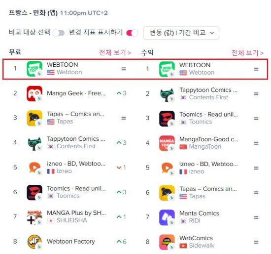 이에 질세라 네이버웹툰도 다음날인 10일 프랑스에서의 선전 소식을 알렸다. 역시 앱애니의 조사 결과를 인용, 프랑스 구글 플레이 만화 부문에서 매출 및 다운로드 수 각각 1위 기록했다고 밝혔다.