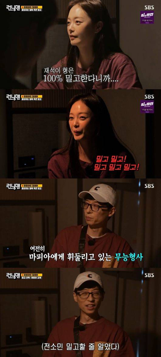 12일 오후 방송된 SBS 예능프로그램 '런닝맨'은 '혼돈의 런닝맨' 편으로 꾸며졌다. 이날 지석진, 유재석, 김종국, 하하, 양세찬, 송지효, 전소민은 랜덤으로 정해진 마피아를 찾는 레이스를 진행했다.