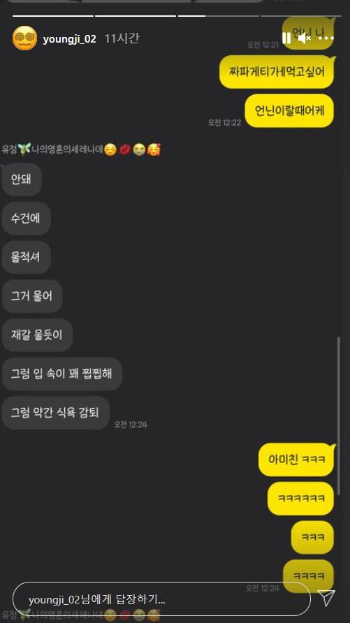 12일 이영지는 자신의 SNS 인스타그램 스토리에 최유정과의 대화내용을 공개했다.