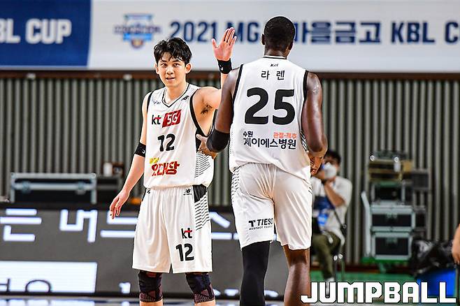 [점프볼=상주/박상혁 기자] 12일 경상북도 상주시 상주실내체육관에서 열린 '2021 MG새마을금고 KBL컵 대회' 부산 KT와 안양 KGC인삼공사의 경기, KT 박준영이 캐디 라렌과 하이파이브를 하고 있다.