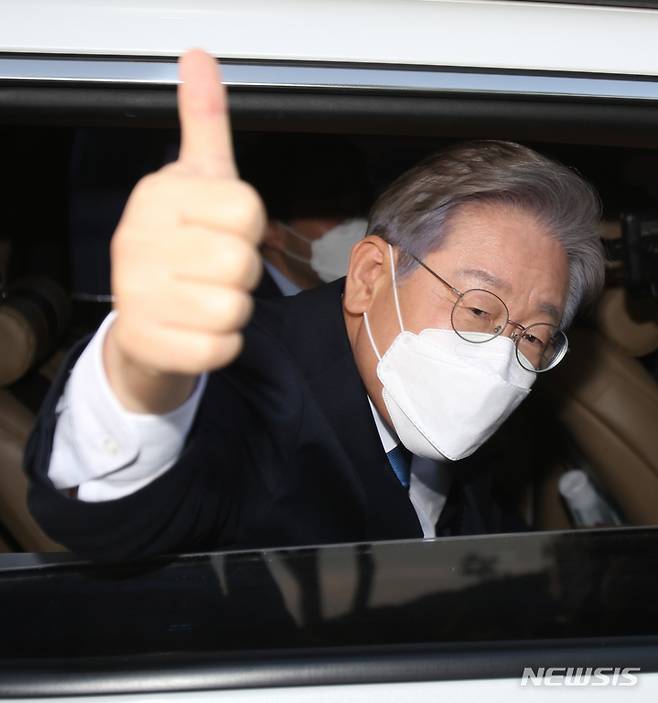 [원주=뉴시스] 김경목 기자 = 12일 오후 이재명 더불어민주당 대선 경선 후보가 강원도 원주시 오크밸리 리조트 컨벤션홀에서 열린 제20대 대통령선거 후보자 선출을 위한 합동연설회에서 1위를 하고 행사장을 떠나면서 지지자들에게 엄지손가락을 치켜세우며 자신의 승리 소식을 전하고 있다. 2021.09.12. photo31@newsis.com