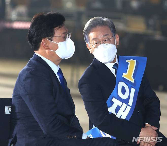 [원주=뉴시스] 김경목 기자 = 12일 오후 이재명 더불어민주당 대선 경선 후보가 강원도 원주시 오크밸리 리조트 컨벤션홀에서 열린 제20대 대통령선거 후보자 선출을 위한 합동연설회에 행사장에서 송영길 대표에게 말을 건네고 있다. 2021.09.12. photo31@newsis.com
