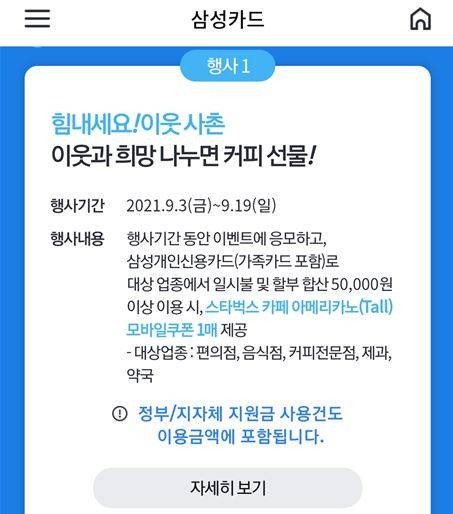 일례로 삼성카드의 경우 오는 19일까지 삼성개인신용카드(가족카드 포함)로 편의점, 음식점, 커피전문점, 제과, 약국 등에서 국민지원금 포함 5만원 이상 이용 시 이벤트 응모 고객 대상 전원에게 커피쿠폰 1매를 제공합니다.