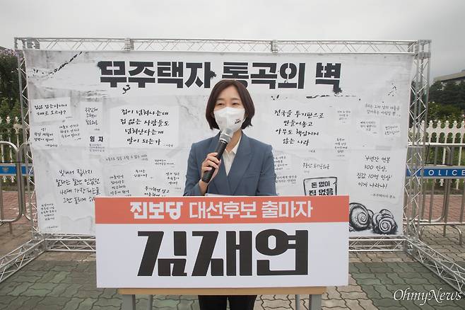 | ▲ 대선 출마를 선언한 진보당 김재연 상임대표가 지난 8월 26일 오전 여의도 국회 정문앞에 설치된 무주택자 통곡의벽 앞에서 기자회견을 하고 있다. |