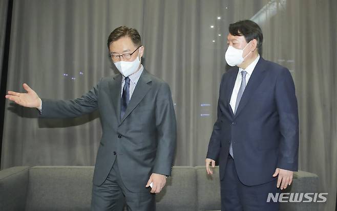 [서울=뉴시스] 국회사진기자단 = 국민의힘 윤석열과 최재형 대선 경선 예비후보가 12일 서울 여의도 글래드 호텔에서 정권의 정치공작과 국정원의 대선 개입 의혹 문제에 대처하기 위한 회동을 마친 뒤 이동하고 있다. 2021.09.12. photo@newsis.com