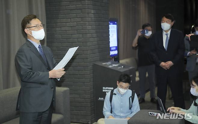 [서울=뉴시스] 국회사진기자단 = 국민의힘 최재형 대선 경선 예비후보가 12일 서울 여의도 글래드 호텔에서 윤석열 예비후보와의 회동을 마친 뒤 ‘고발사주’ 사건관련 입장문을 낭독하고 있다. 2021.09.12. photo@newsis.com