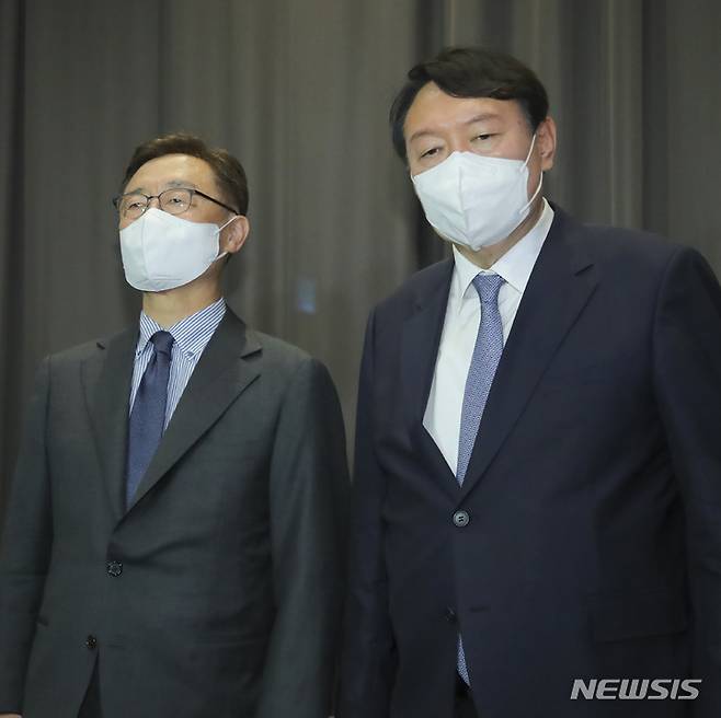 [서울=뉴시스] 국회사진기자단 = 국민의힘 윤석열과 최재형 대선 경선 예비후보가 12일 서울 여의도 글래드 호텔에서 정권의 정치공작과 국정원의 대선 개입 의혹 문제에 대처하기 위한 회동을 마친 뒤 회동 결과를 밝히고 있다. 2021.09.12. photo@newsis.com