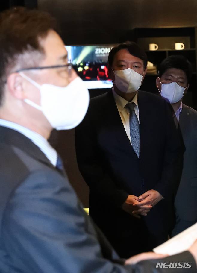 [서울=뉴시스] 국회사진기자단 = 국민의힘 윤석열 대선 예비후보가 12일 서울 여의도 글래드호텔 레스토랑에서 정권의 정치공작과 국정원의 대선 개입 의혹 문제와 관련해 입장문을 발표하는 최재형 후보를 바라보고 있다. 2021.09.12. photo@newsis.com
