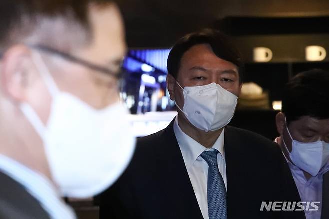 [서울=뉴시스] 국회사진기자단 = 국민의힘 윤석열 대선 예비후보가 12일 서울 여의도 글래드호텔 레스토랑에서 정권의 정치공작과 국정원의 대선 개입 의혹 문제와 관련해 입장문을 발표하는 최재형 후보를 바라보고 있다. 2021.09.12. photo@newsis.com