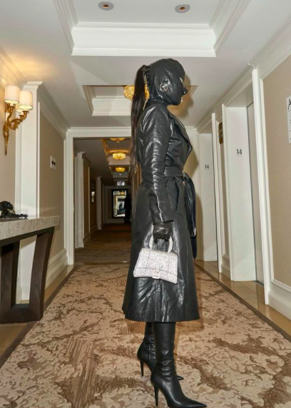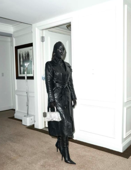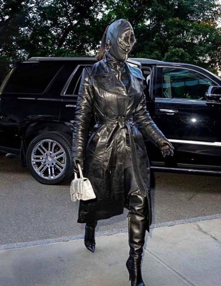 스틸레토 굽 부츠, 헐렁한 바지, 트렌치코트, 그리고 뒷머리를 내밀 수 있는 공간이 있는 완전한 머리 덮개가 그 패션. 더욱이 이 가죽은 카다시안의 눈코입까지 완벽하게 가렸다.