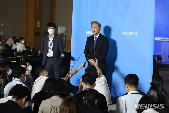 [원주=뉴시스] 김경목 기자 = 12일 오후 이재명 더불어민주당 대선 경선 후보가 강원도 원주시 오크밸리 리조트 컨벤션홀에서 열린 제20대 대통령선거 후보자 선출을 위한 합동연설회에서 1위를 하고 기자들 앞에서 질문을 받고 답변하고 있다. 2021.09.12. photo31@newsis.com
