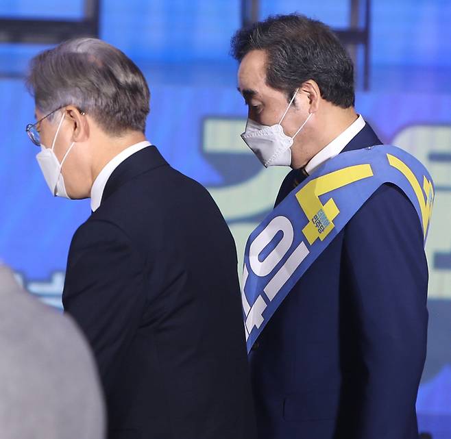 [원주=뉴시스] 김경목 기자 = 12일 오후 이재명·이낙연 더불어민주당 대선 경선 후보들이 강원도 원주시 오크밸리 리조트 컨벤션홀에서 열린 제20대 대통령선거 후보자 선출을 위한 합동연설회에서 서 있다. 2021.09.12. photo31@newsis.com