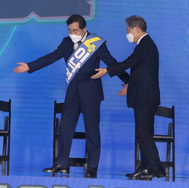 [원주=뉴시스] 김경목 기자 = 12일 오후 이재명·이낙연 더불어민주당 대선 경선 후보들이 강원도 원주시 오크밸리 리조트 컨벤션홀에서 열린 제20대 대통령선거 후보자 선출을 위한 합동연설회에서 서로 먼저 가라며 양보하고 있다. 2021.09.12. photo31@newsis.com