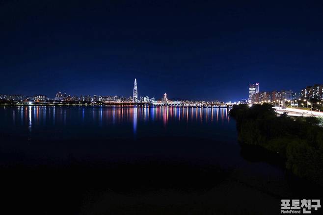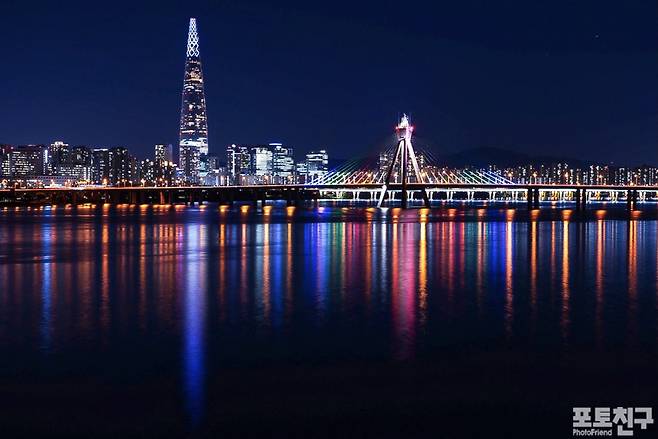 올림픽대교의 화려한 조명과 우뚝 솟은 롯데타워,