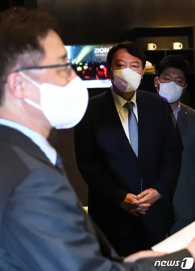 (서울=뉴스1) 이동해 기자 = 국민의힘 윤석열 대선 예비후보가 12일 서울 여의도 글래드호텔 레스토랑에서 정권의 정치공작과 국정원의 대선 개입 의혹 문제와 관련해 입장문을 발표하는 최재형 후보를 바라보고 있다. 2021.9.12/뉴스1