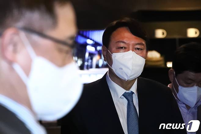(서울=뉴스1) 이동해 기자 = 국민의힘 윤석열 대선 예비후보가 12일 서울 여의도 글래드호텔 레스토랑에서 정권의 정치공작과 국정원의 대선 개입 의혹 문제와 관련해 입장문을 발표하는 최재형 후보를 바라보고 있다. 2021.9.12/뉴스1