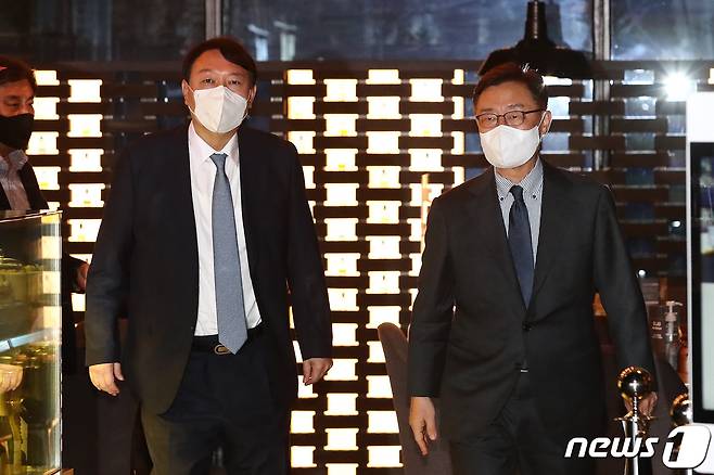 (서울=뉴스1) 이동해 기자 = 국민의힘 윤석열, 최재형 대선 경선 예비후보가 12일 서울 여의도 글래드 호텔에서 정권의 정치공작과 국정원의 대선 개입 의혹 등에 대한 대처방안을 논의한 뒤 밖으로 나서고 있다. 2021.9.12/뉴스1