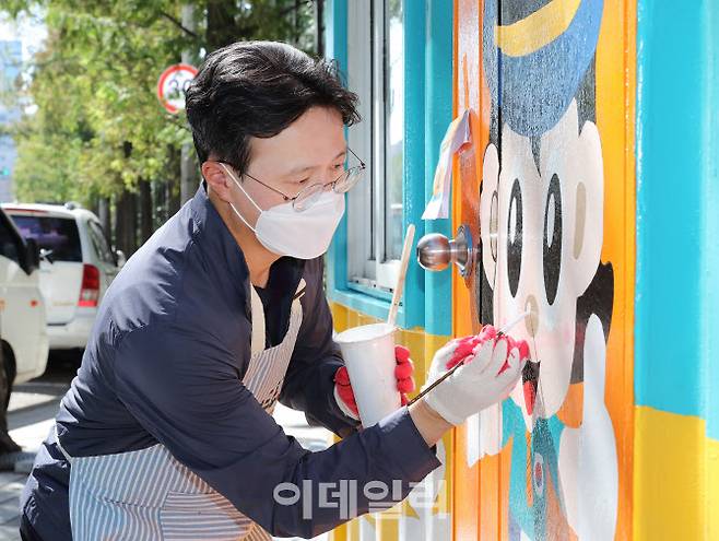 [이데일리 김태형 기자] 채현일 영등포구청장이 12일 영등포역 보도 육교 아래 설치된 자율방범대 초소 도색 작업을 하고 있다.