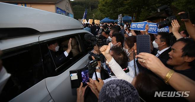 [원주=뉴시스] 김경목 기자 = 12일 오후 이재명 더불어민주당 대선 경선 후보 지지자들이 강원도 원주시 오크밸리 리조트 컨벤션홀에서 열린 제20대 대통령선거 후보자 선출을 위한 합동연설회가 끝나 행사장을 떠나는 이재명 후보에게 환호하고 있다. 2021.09.12. photo31@newsis.com