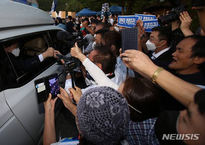 [원주=뉴시스] 김경목 기자 = 12일 오후 이재명 더불어민주당 대선 경선 후보 지지자들이 강원도 원주시 오크밸리 리조트 컨벤션홀에서 열린 제20대 대통령선거 후보자 선출을 위한 합동연설회가 끝나 행사장을 떠나는 이재명 후보에게 환호하고 있다. 2021.09.12. photo31@newsis.com