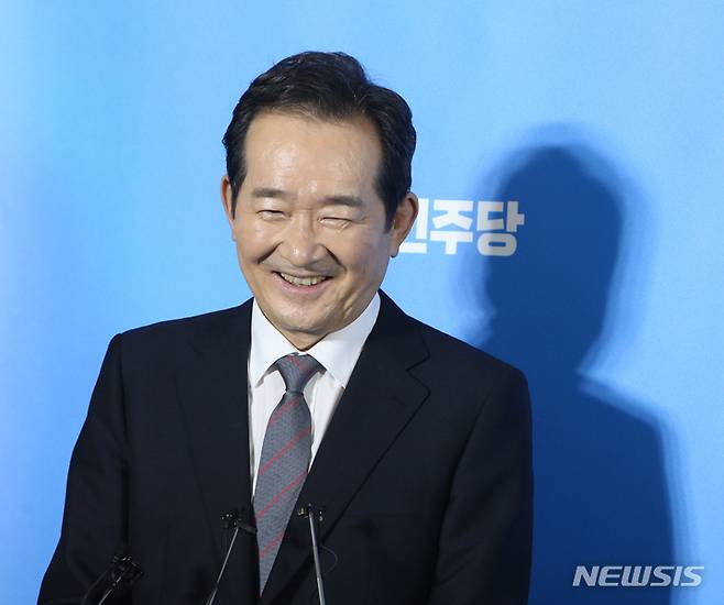 [원주=뉴시스] 김경목 기자 = 12일 오후 정세균 더불어민주당 대선 경선 후보가 강원도 원주시 오크밸리 리조트 컨벤션홀에서 열린 제20대 대통령선거 후보자 선출을 위한 합동연설회가 끝나고 기자들 앞에 섰다. 2021.09.12. photo31@newsis.com