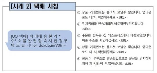 과학기술정보통신부와 금융위원회, 경찰청, 한국인터넷진흥원(KISA), 금융감독원은 스미싱 신고 현황 중 93%가 택배 사칭인 만큼 추석 명절 기간 배송 확인 문자에 유의해야 한다고 12일 당부했다.