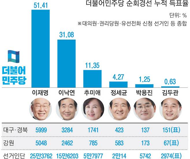 이 지사는 12일 강원 원주 오크밸리 리조트에서 공개된 1차 국민선거인단 투표자 49만6672명 중 25만3762표를 받아 51.09%의 득표율을 기록했다. 충청과 대구·경북, 강원 지역 등 네 차례 순회경선에서 대의원·권리당원 득표율 54.11%를 기록한 데 이어 일반당원 및 국민으로 구성된 국민선거인단에게도 과반의 지지를 받은 것이다. 2위 이낙연 전 대표와의 득표율 차는 20.33%포인트가 됐다.