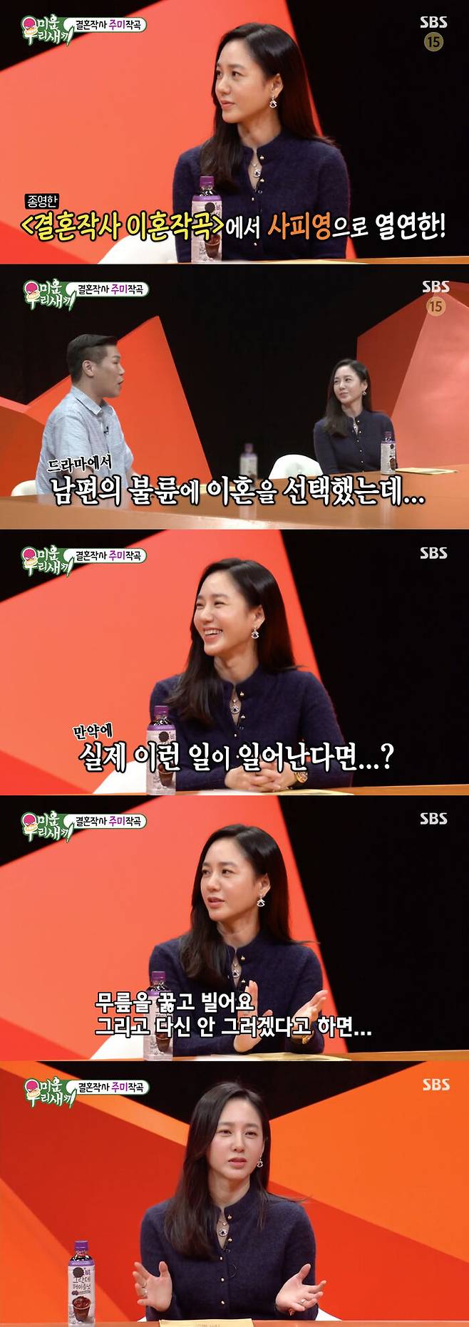 이날 방송에서 서장훈은 박주미에게 "최근 종영한 드라마에서 믿었던 남편의 불륜을 알고 쿨하게 이혼을 선택했다"라며 "만약 현실에서 이런 일이 있다면 어떨 거 같냐"라고 물었다.