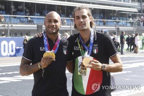 epa09463427 Italian track and field sprinter Lamont Marcell Jacobs (L) and Italian high jumper Gianmarco Tamberi (R) pose with their olympic gold medals ahead of the Formula One Grand Prix of Italy at the Autodromo Nazionale Monza race track in Monza, Italy, 12 September 2021. EPA/MATTEO BAZZI
