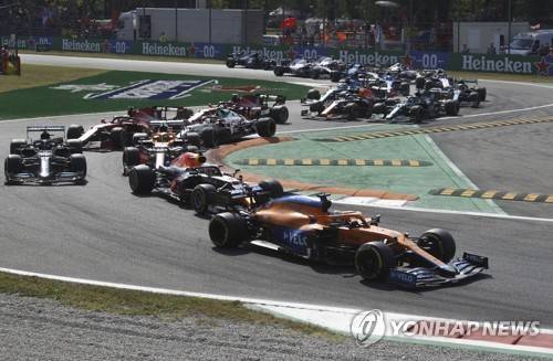 epa09463461 Australian Formula One driver Daniel Ricciardo of McLaren F1 Team leads the pack of cars during the start of the Formula One Grand Prix of Italy at the Autodromo Nazionale Monza race track in Monza, Italy, 12 September 2021. EPA/MATTEO BAZZI