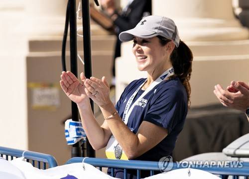 epa09463468 Crown Princess Mary of Denmark applauds in the finish area as she runs 5 km during the Royal Run in Aalborg, Denmark, 12 September 2021. EPA/Henning Bagger DENMARK OUT