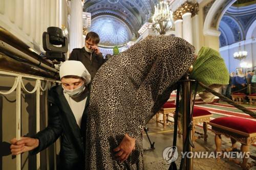 epa09463482 Orthodox believers attend a religious service celebrating the 800th birthday of Grand Duke Alexander Nevsky at the Trinity Cathedral of the Alexander Nevsky Lavra in St. Petersburg, Russia, 12 September 2021. St. Alexander Nevsky is considered the heavenly protector of St. Petersburg. EPA/ANATOLY MALTSEV