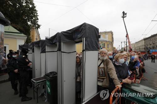 epa09463489 Orthodox believers attend a religious service celebrating the 800th birthday of Grand Duke Alexander Nevsky near the Alexander Nevsky Lavra in St. Petersburg, Russia, 12 September 2021. St. Alexander Nevsky is considered the heavenly protector of St. Petersburg. EPA/ANATOLY MALTSEV