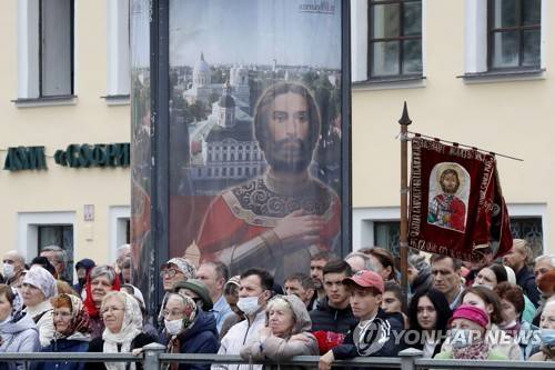epa09463491 Orthodox believers attend a religious service celebrating the 800th birthday of Grand Duke Alexander Nevsky near the Alexander Nevsky Lavra in St. Petersburg, Russia, 12 September 2021. St. Alexander Nevsky is considered the heavenly protector of St. Petersburg. EPA/ANATOLY MALTSEV
