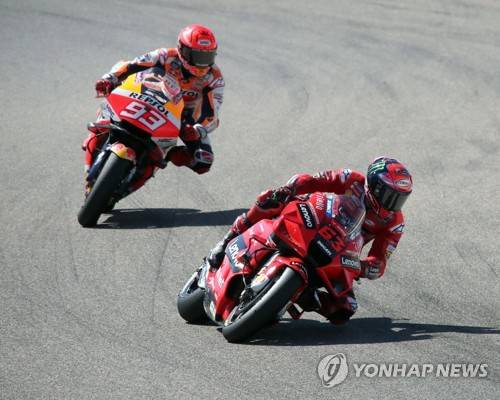 epa09463501 Italian MotoGP rider Francesco Bagnaia (R) of Ducati Lenovo Team and Spanish MotoGP rider Marc Marquez of Respsol Honda Team in action during the Motorcycling Grand Prix of Aragon at MotorLand Aragon circuit in Alcaniz, Teruel, northern Spain, 12 September 2021. EPA/JAVIER CEBOLLADA