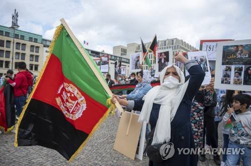 Participants in a demonstration against the Taliban and Pakistan's role in Afghanistan stand in Paris Square in Berlin, Germany, Sunday, Sept. 12, 2021. (Christophe Gateau/dpa via AP)
