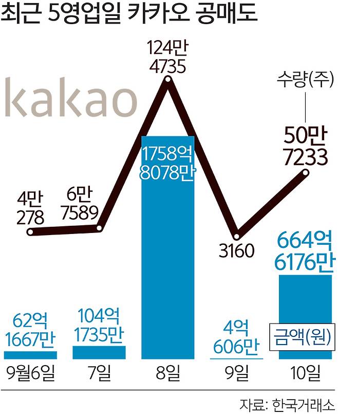 특히 지난 8일에는 1759억원의 공매도 거래액을 기록하며 지난 5월 공매도 재개 이후 한 종목의 일간 공매도로는 가장 많은 금액으로 집계됐다. 이에 카카오는 공매도 과열 종목으로 지정돼 그다음 날인 9일 하루 동안 공매도가 금지됐다.