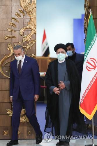 epa09463507 A handout photo made available by the Iranian presidential office shows, Iranian president Ebrahim Raisi (R) and Iraqi Prime Minister Mustafa Al-Kadhimi (L) arriving for a joint press conference at the presidential palace in Tehran, Iran, 12 September 2021. Al-Kadhimi is in Tehran to meet with Iranian officials. EPA/HANDOUT HANDOUT EDITORIAL USE ONLY/NO SALES