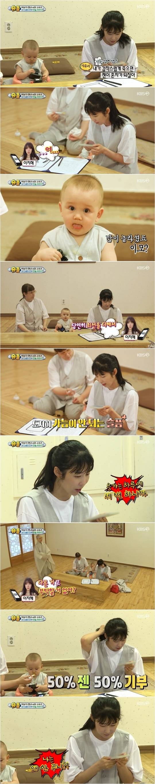 그러나 사유리는 "응가는 하루 세 번 한다"고 말해 분위기를 반전시키는가 하면, "너에게 계좌 비밀번호를 알려줄게. 50%는 젠에게, 50%는 기부해 달라"고 부탁했고, 이지혜는 "나는 왜 안 주니?"라고 말해 웃음을 자아냈다.(사진=KBS 2TV '슈퍼맨이 돌아왔다' 방송 캡처)