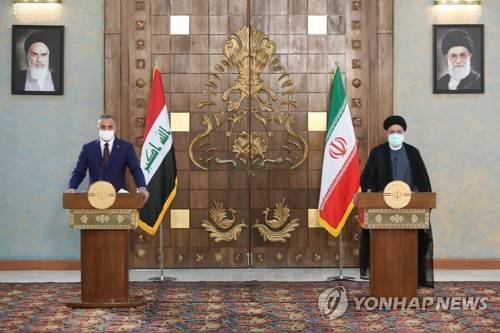 epa09463514 A handout photo made available by the Iranian presidential office shows, Iranian president Ebrahim Raisi (R) and Iraqi Prime Minister Mustafa Al-Kadhimi (L) during a joint press conference at the presidential palace in Tehran, Iran, 12 September 2021. Al-Kadhimi is in Tehran to meet with Iranian officials. EPA/HANDOUT HANDOUT EDITORIAL USE ONLY/NO SALES